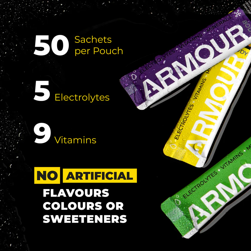 Ingredients: Body Armour Hydration Blend (Glycine, Glutamine, Calcium Lactate monohydrate, Magnesium Glycinate, Sodium Chloride, Potassium Chloride, Silica Sipernat, Sea Buckthorn, L-Theanine), Natural Flavours used – Orange/ Strawberry/ Lime/ Lemon/ Blackcurrant/ Pineapple/ Raspberry, Arabic Gum, Citric Acid, Natural Colours used – Red Beetroot/ Curcumin/ Blue Spirulina, Panmol B, Thaumatin.