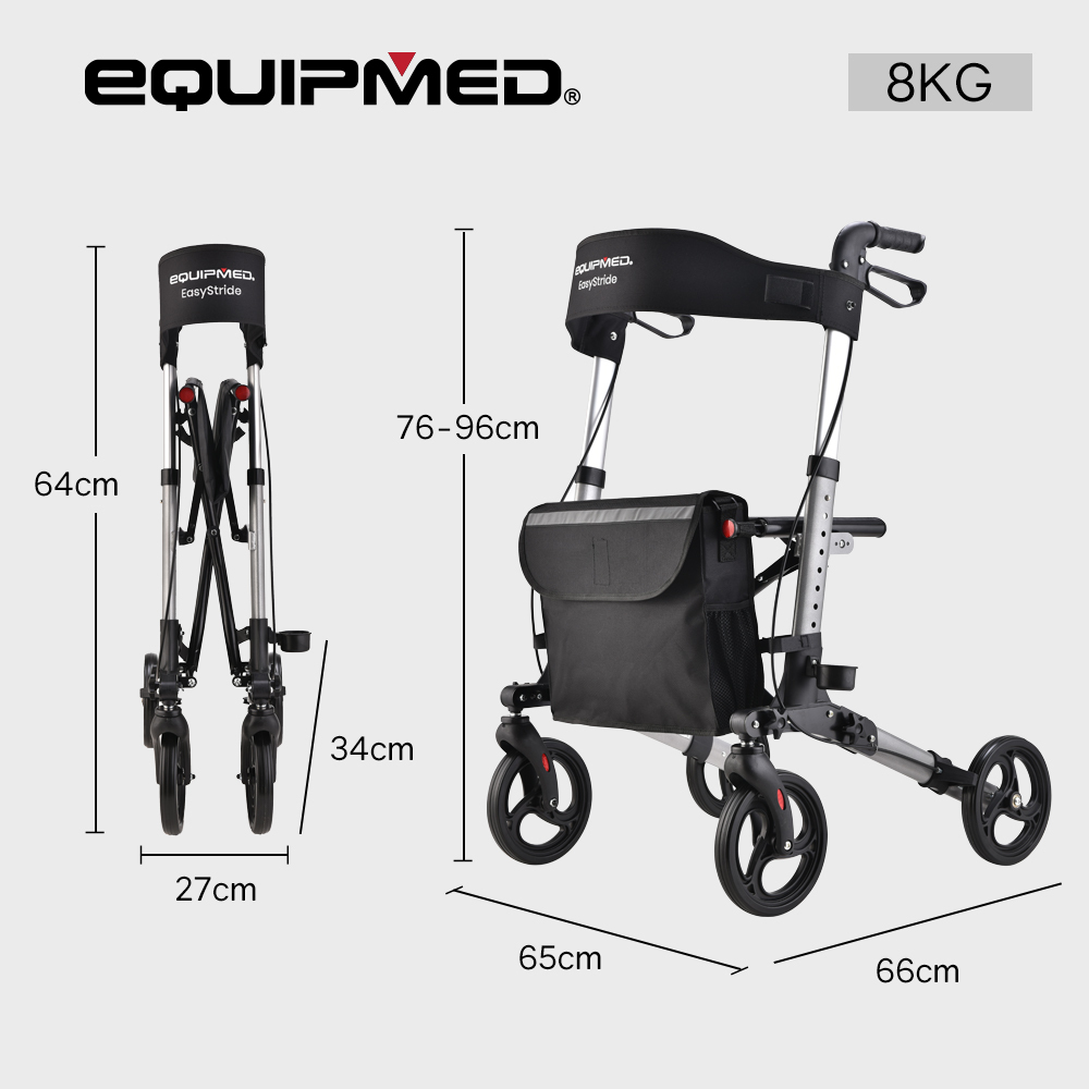 Practicality, reliability, comfort and smooth mobility is required to offer the freedom and confidence that is well deserved – and the Equipmed Easy Stride Rollator ticks all the boxes. Independence is only a step away thanks to the stylish ultra-light 8kg aluminium design with adjustable handle height. The handles themselves feature an ergonomic design and easy-squeeze dual-action brakes. A detachable front carry satchel allows for convenient storage of personal belongings and reading material.