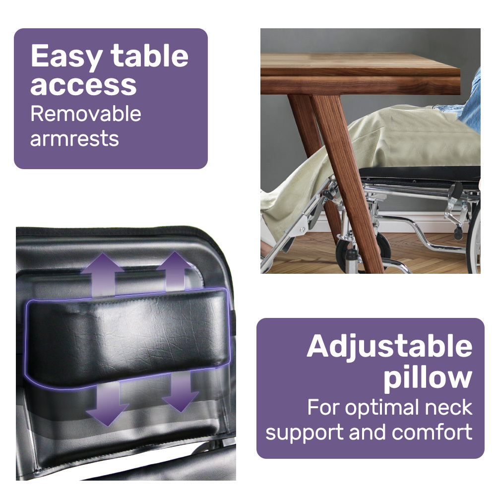 It features plush armrests, padded leg supports, length adjustable footrests, generous seat width and thick cushion to ensure a comfortable journey. For added comfort, an adjustable pillow provides neck support.