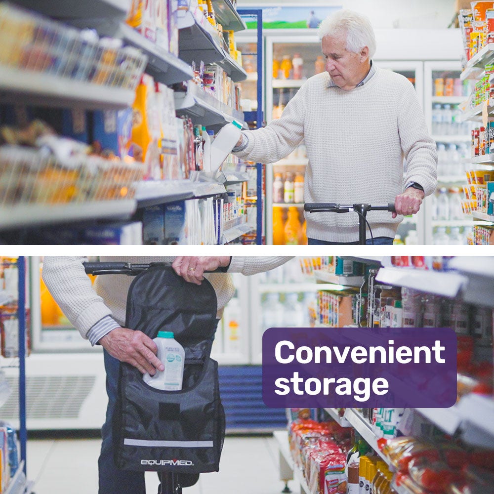 The convenient bag hooks onto the front of the scooter for carrying your belongings.