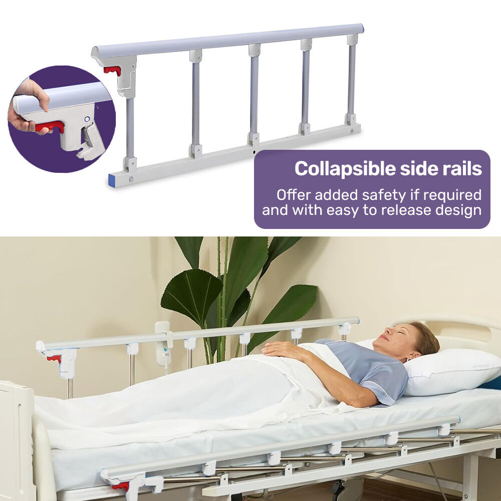 Designed with patient safety and daily usability in mind, the collapsible safety side rails offer extra security and can be lowered for easy patient access. The removable over-bed table provides a stable surface for meals, and conveniently stores on the footboard when not in use. The quick-detach head and footboards offer the option of greater access to the patient or for cleaning purposes.