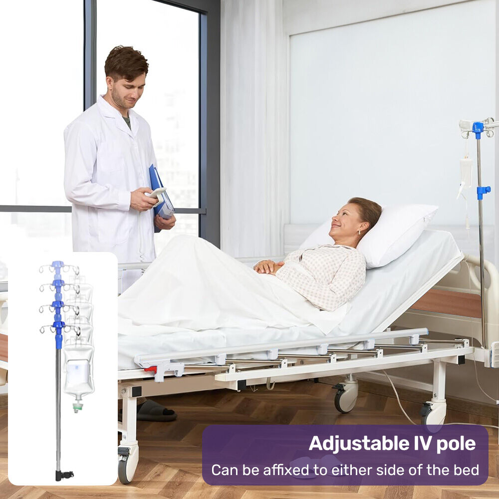 For enhanced care and convenience, the adjustable IV pole provides a stable solution for IV drips and fluid management. Smooth-rolling 125mm castors allow for easy repositioning when needed, with locking mechanisms to keep the bed securely in place.