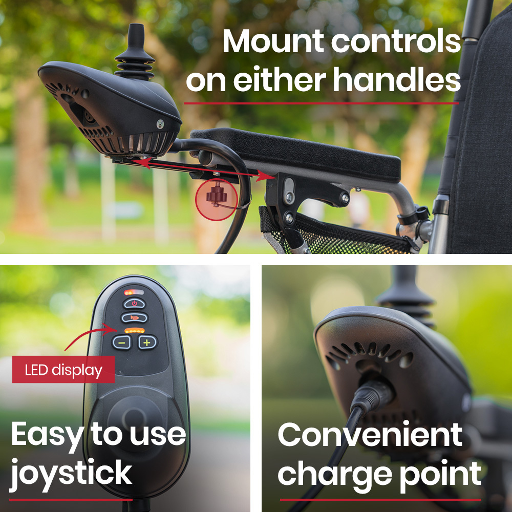 Steering is intuitive using the joystick that can be mounted on either the left or right-hand side, and with easy-to-read LED controls. You can travel along at a sensible speed of up to 6km/h, which is a brisk walking pace.