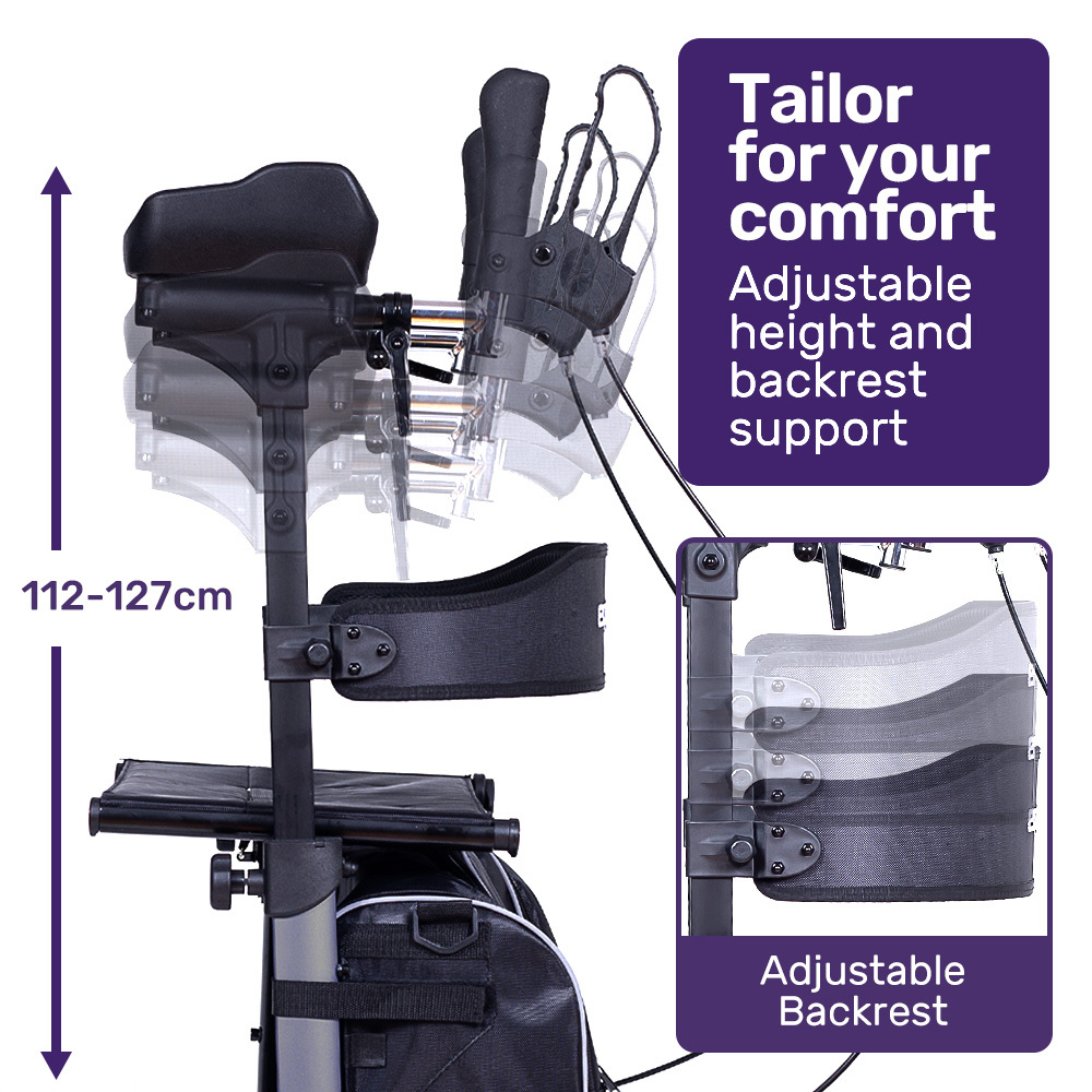The ErgoStride allows you to safely walk upright, eliminating tension in the shoulders and neck allowing users to look comfortably forward. The contoured and padded armrests are height adjustable from 112 cm to 127 cm. The armrest length is also adjustable giving a truly ergonomic personalised fit. The padded 46cm wide seat with adjustable backrest offers a comfortable seat when you need it.