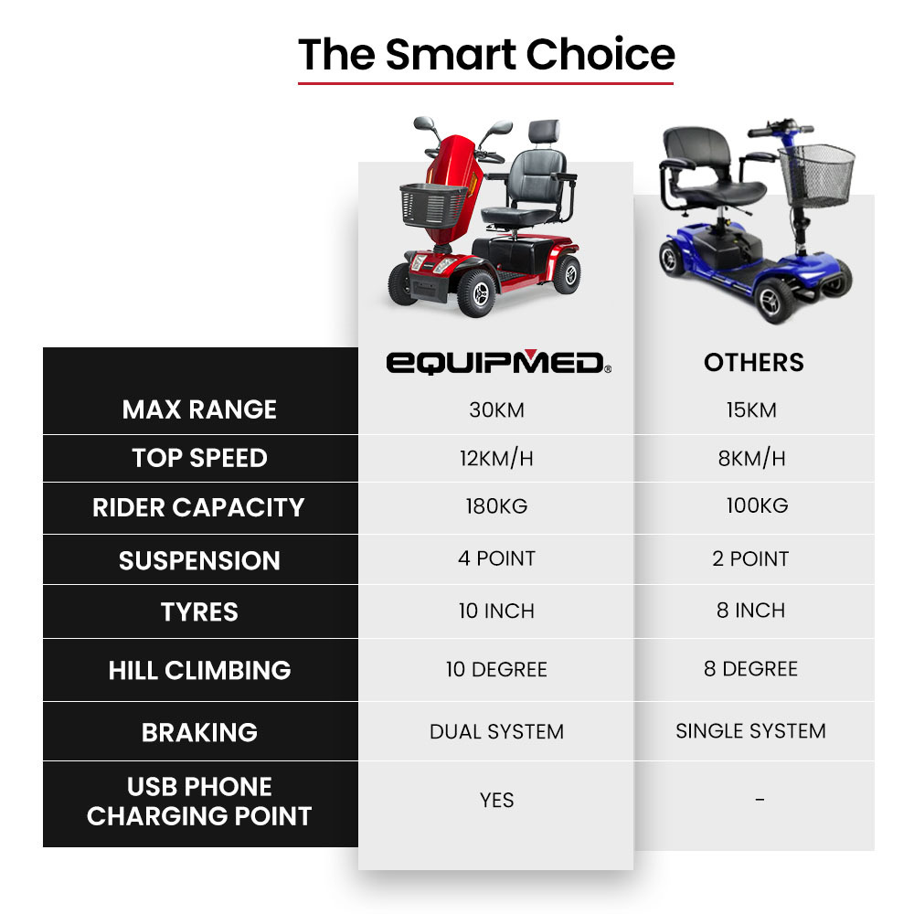 Equipmed has been producing high-quality aged care products for over a decade, and so you can be rest assured that in many years to come youll have no problem when you eventually require new tyres, or a replacement battery.