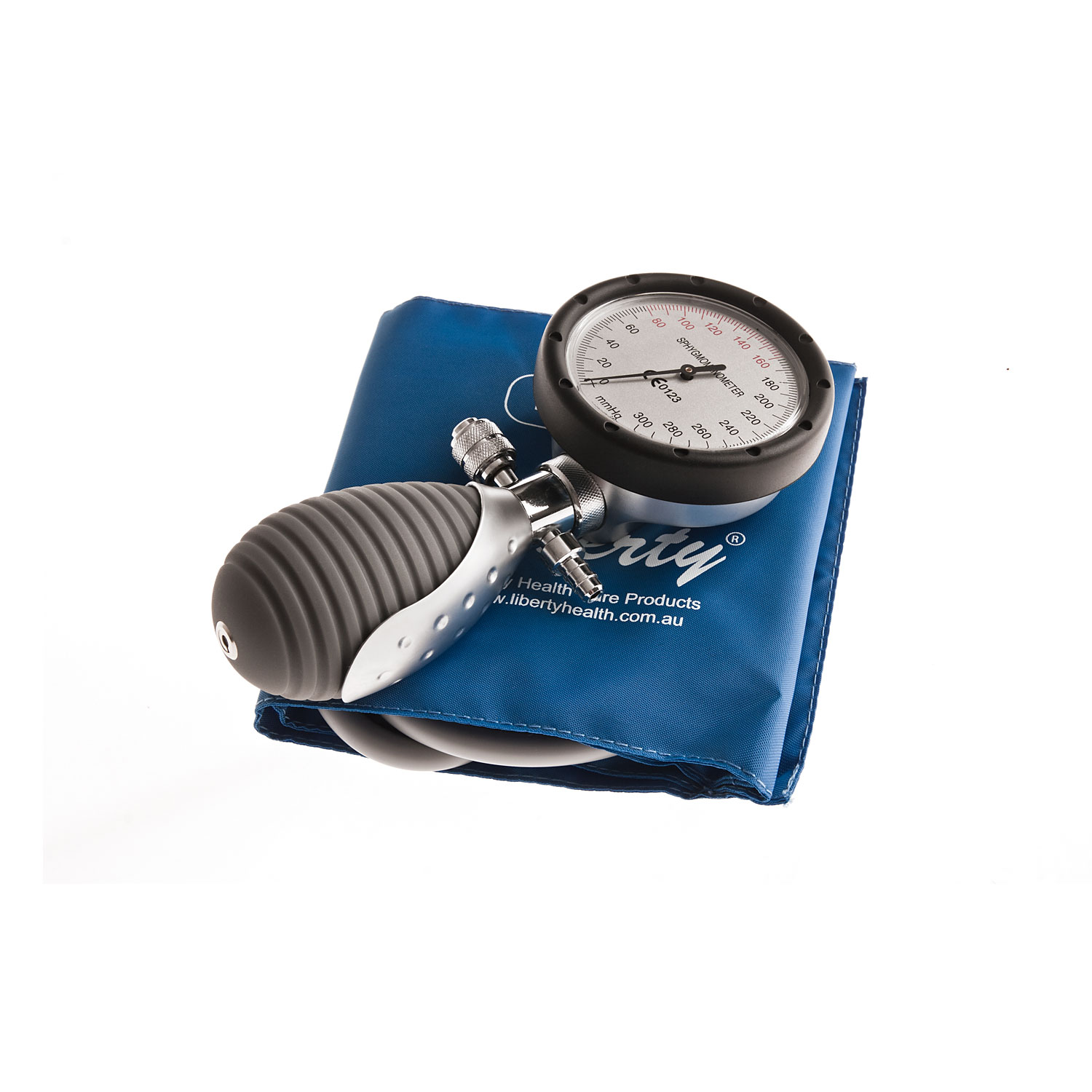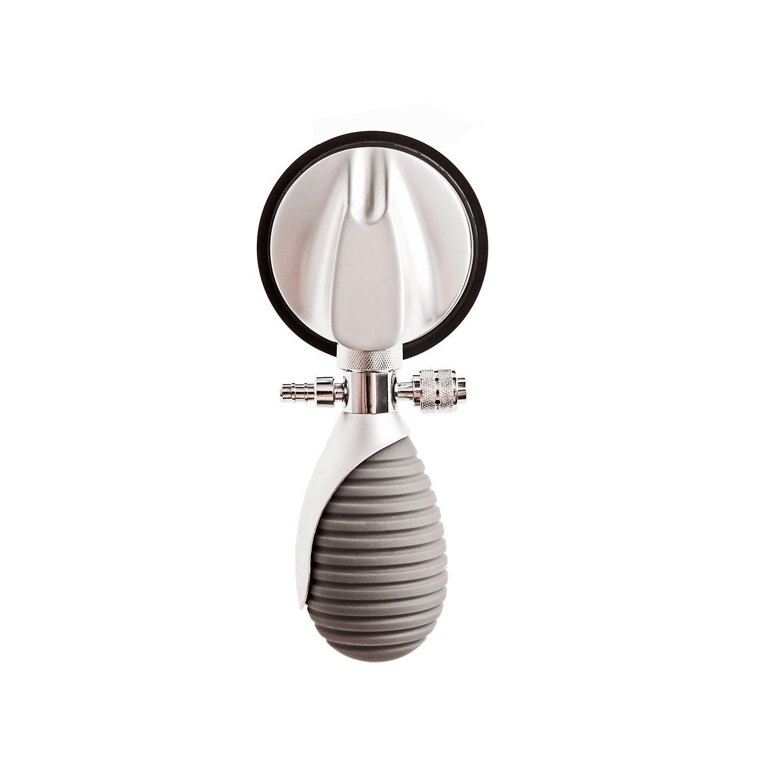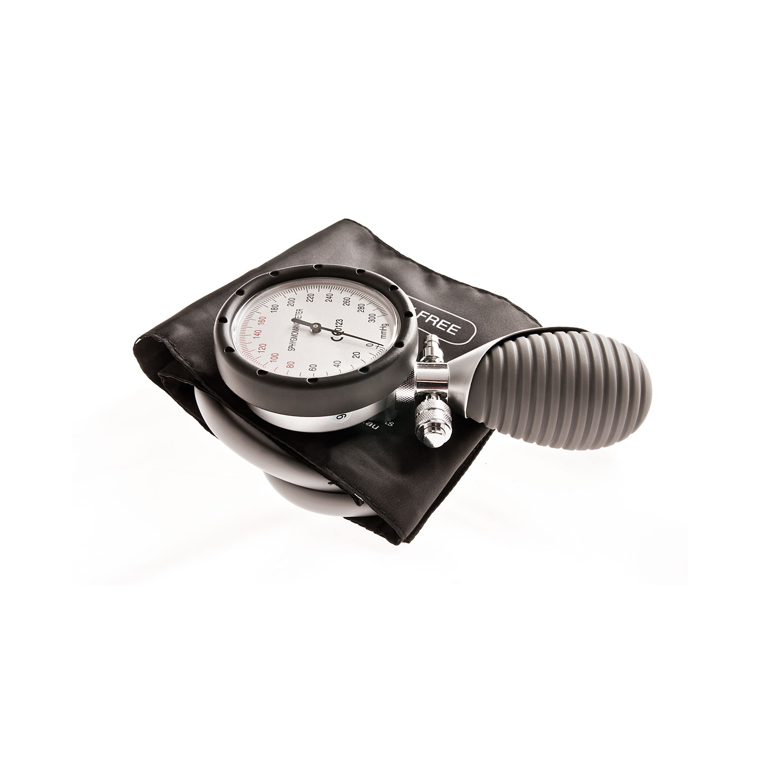 This instrument has improved upon the classic two-handed design by containing the inflation bulb and gauge within the same handpiece, allowing for one-handed operation. The healthcare provider performing the blood pressure assessment can control the bulb, gauge, and air pressure release valve with the same hand.