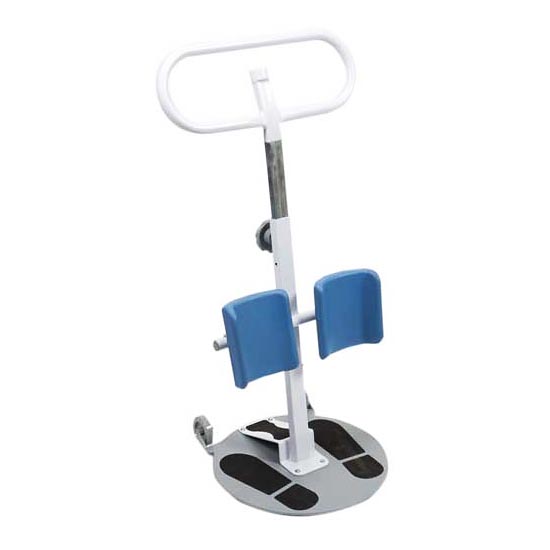 Turner Transfer Aid is a unique device that allows a health worker or carer to safely transfer patients who can bear their own weight when standing. The carer simply positions the device in front of the seated patient and places their foot on it. The patient grasps the handles, places their feet on a secure, non-slip footplate, and pulls themselves up to a standing position. A soft knee pad supports and stabilises them while standing. The carer simply swivels the device so it is pointing towards the new seat or wheelchair. Turner Transfer Aid helps promote patient mobility and independence, while allowing carers to work ergonomically and to maintain eye